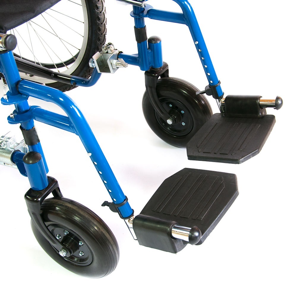 Модель комплектуется подвижными подножками. Для установки опор на кресло-коляску необходимо надеть опору на направляющие, находящиеся на раме и повернуть в сторону от колеса до срабатывания фиксатора.