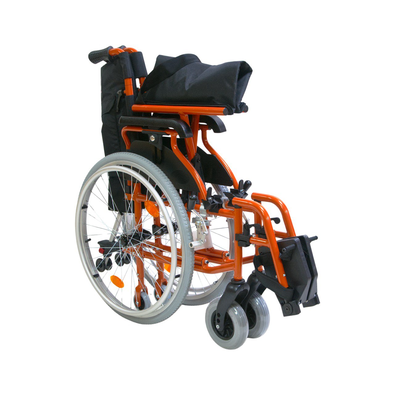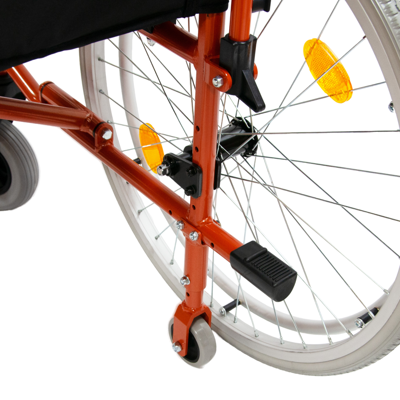 Задние колеса быстросъемные, цельнолитые; оборудованы ободами для движения и светоотражателями (катафотами). Оси задних колес регулируются по вертикали и горизонтали. Передние колеса литые. Также коляска оборудована регулирующимися транзитными колесами для проезда через узкие проходы.
