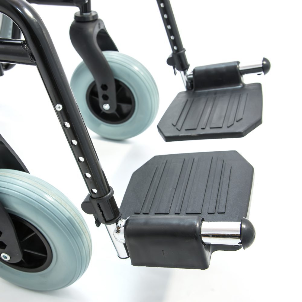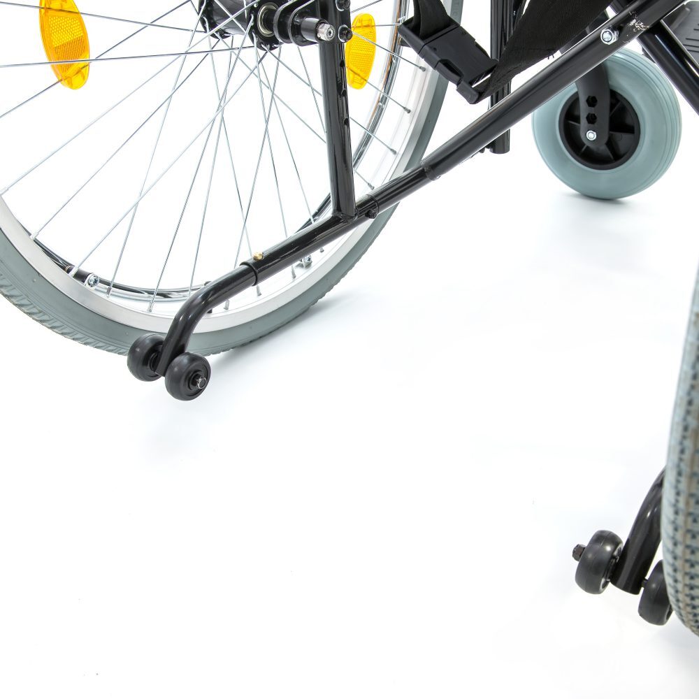 Модель комплектуется подвижными подножками. Для установки опор на кресло-коляску необходимо надеть опору на направляющие, находящиеся на раме и повернуть в сторону от колеса до срабатывания фиксатора.