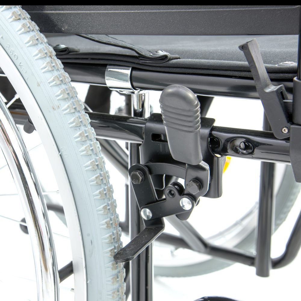 Кресло-коляска снабжена слева и справа рычагами стояночного тормоза, перемещением рычага можно осуществлять торможение кресла-коляски до полного блокирования.