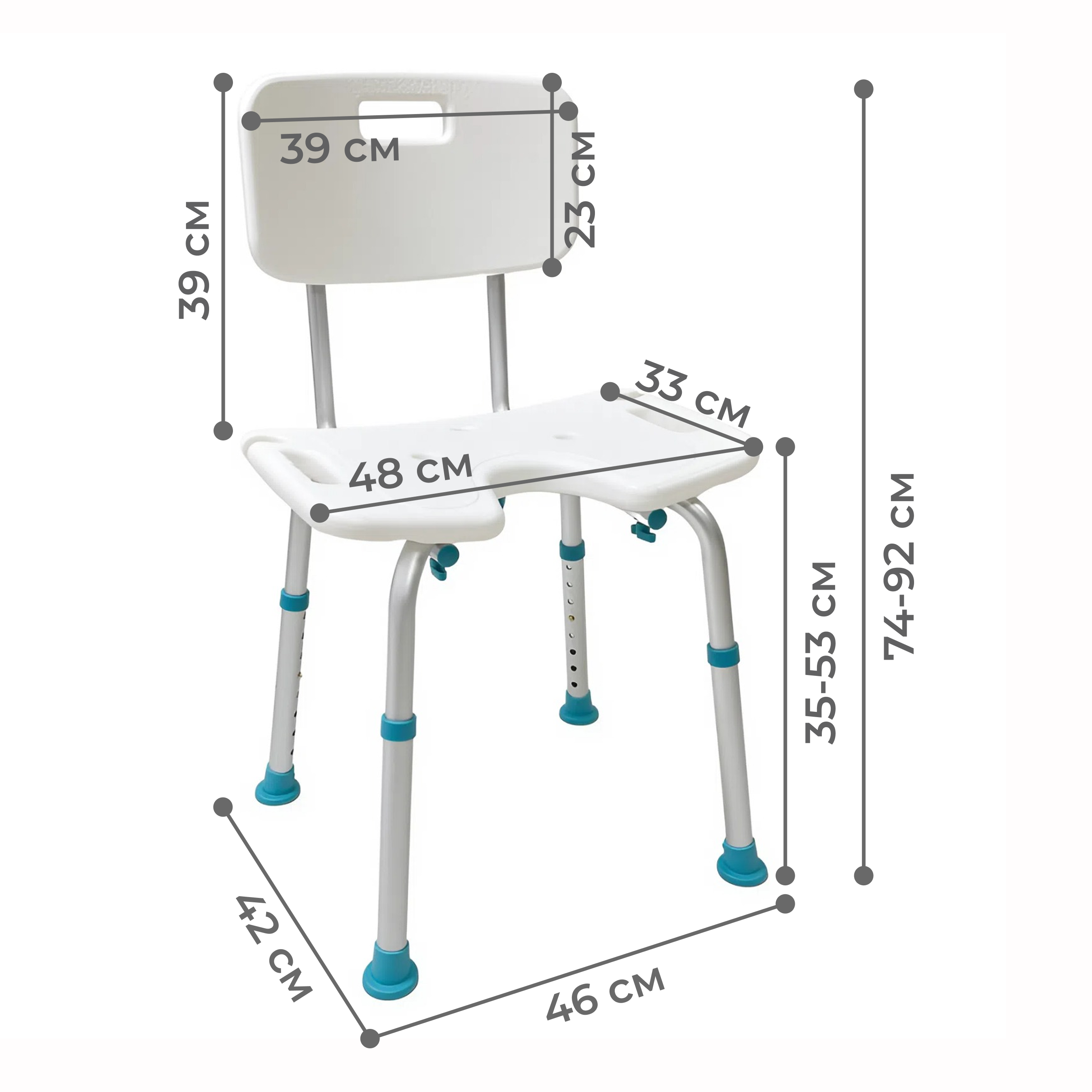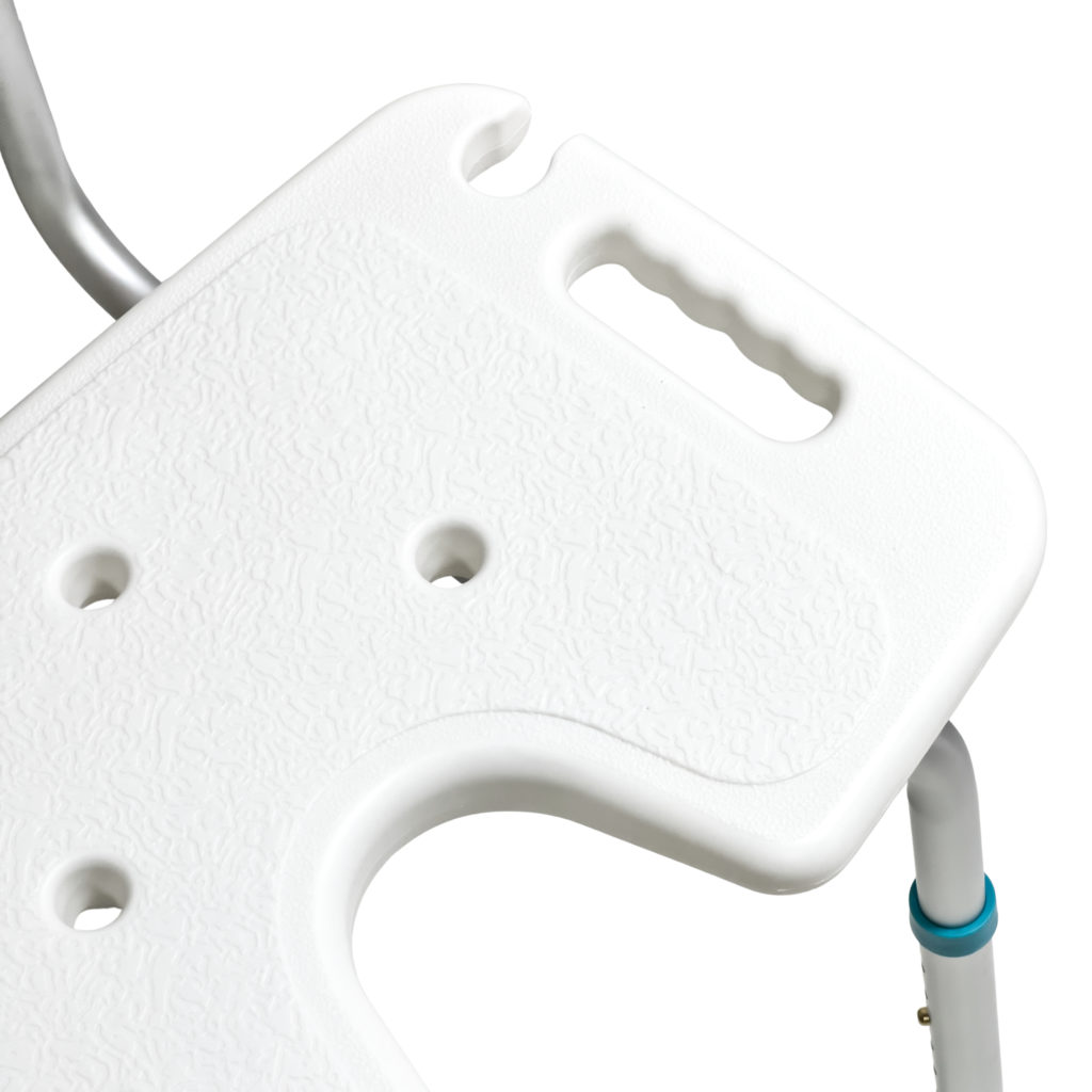 гигиенический вырез. Высота ножек регулируется, что позволяет адаптировать изделие под индивидуальные потребности пользователя. Резиновые наконечники обеспечивают надежное сцепление с поверхностью, предотвращая скольжение.