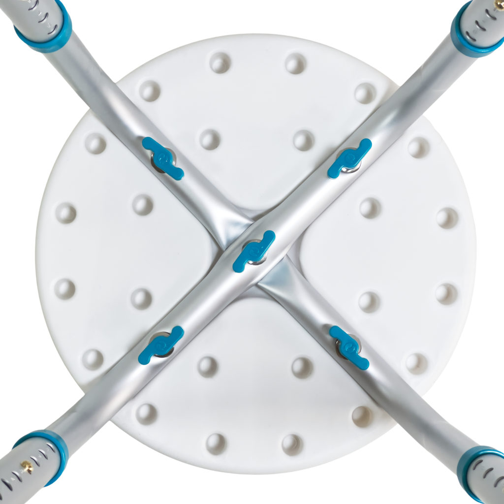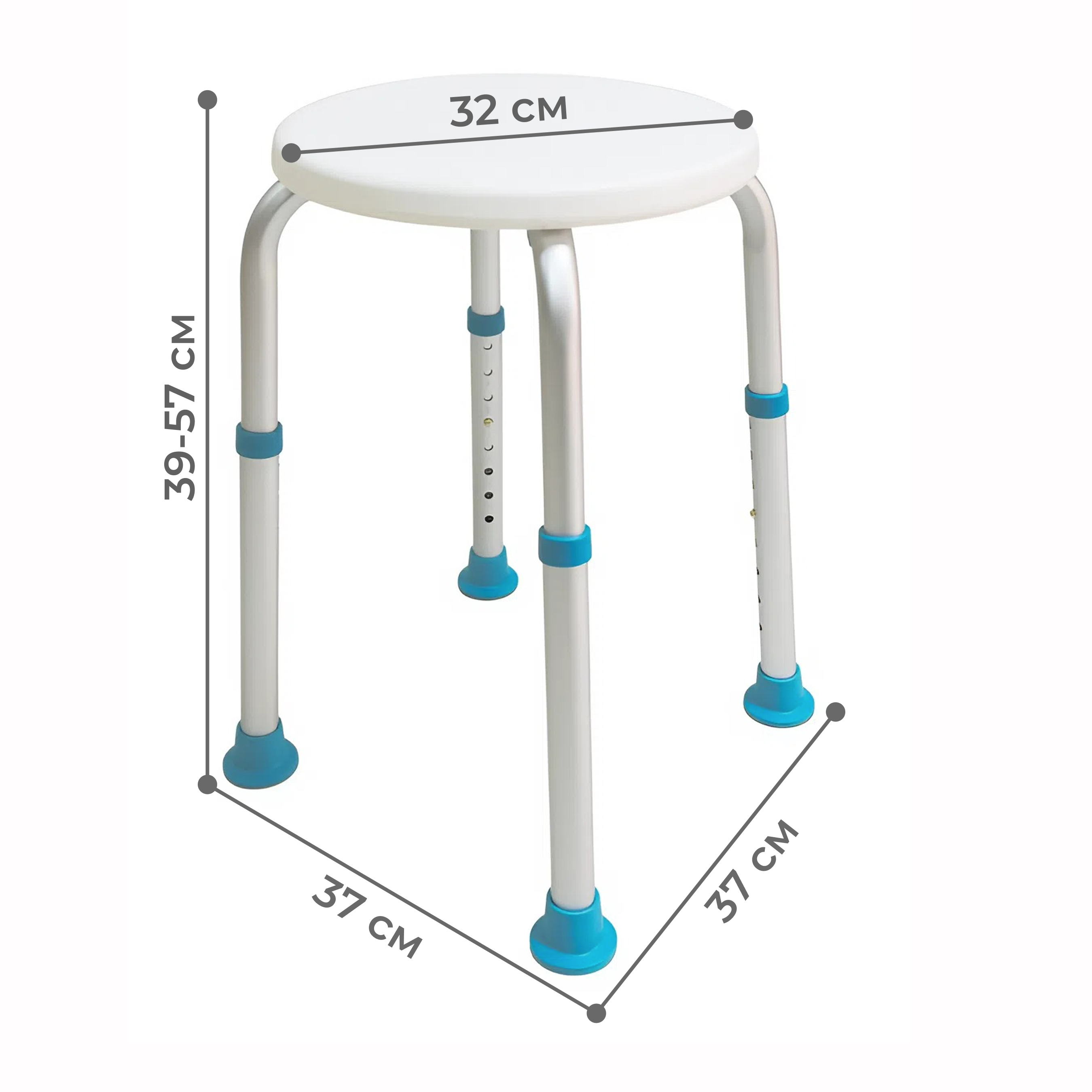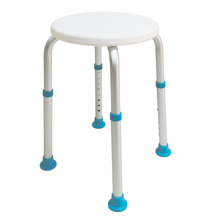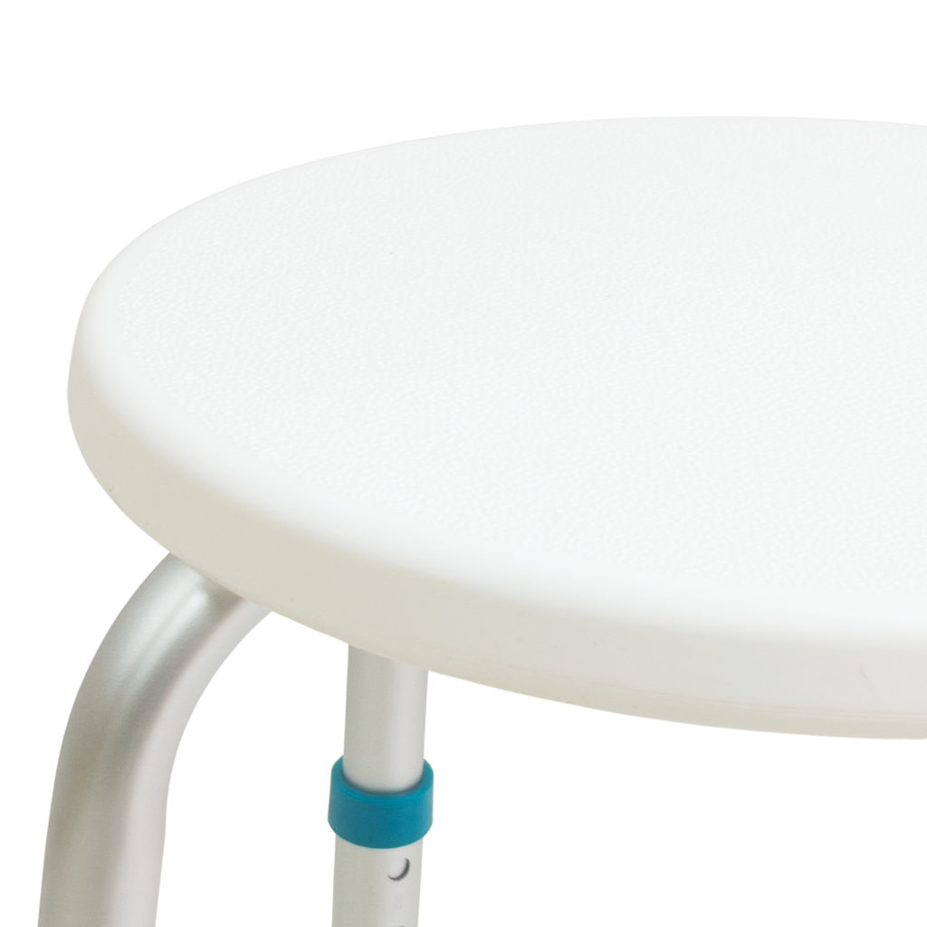 Конструкция стула выполнена из прочного алюминиевого каркаса, устойчивого к влаге и коррозии. Сиденье изготовлено из нескользящего пластика. Высота ножек регулируется (8 положений регулировки), что позволяет адаптировать изделие под индивидуальные потребности пользователя. Резиновые наконечники обеспечивают надежное сцепление с поверхностью, предотвращая скольжение. Стул лёгкий, устойчивый и прост в уходе — идеальный помощник для ежедневного использования в ванной комнате.